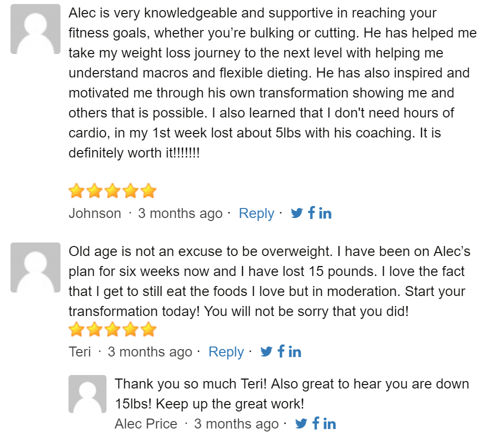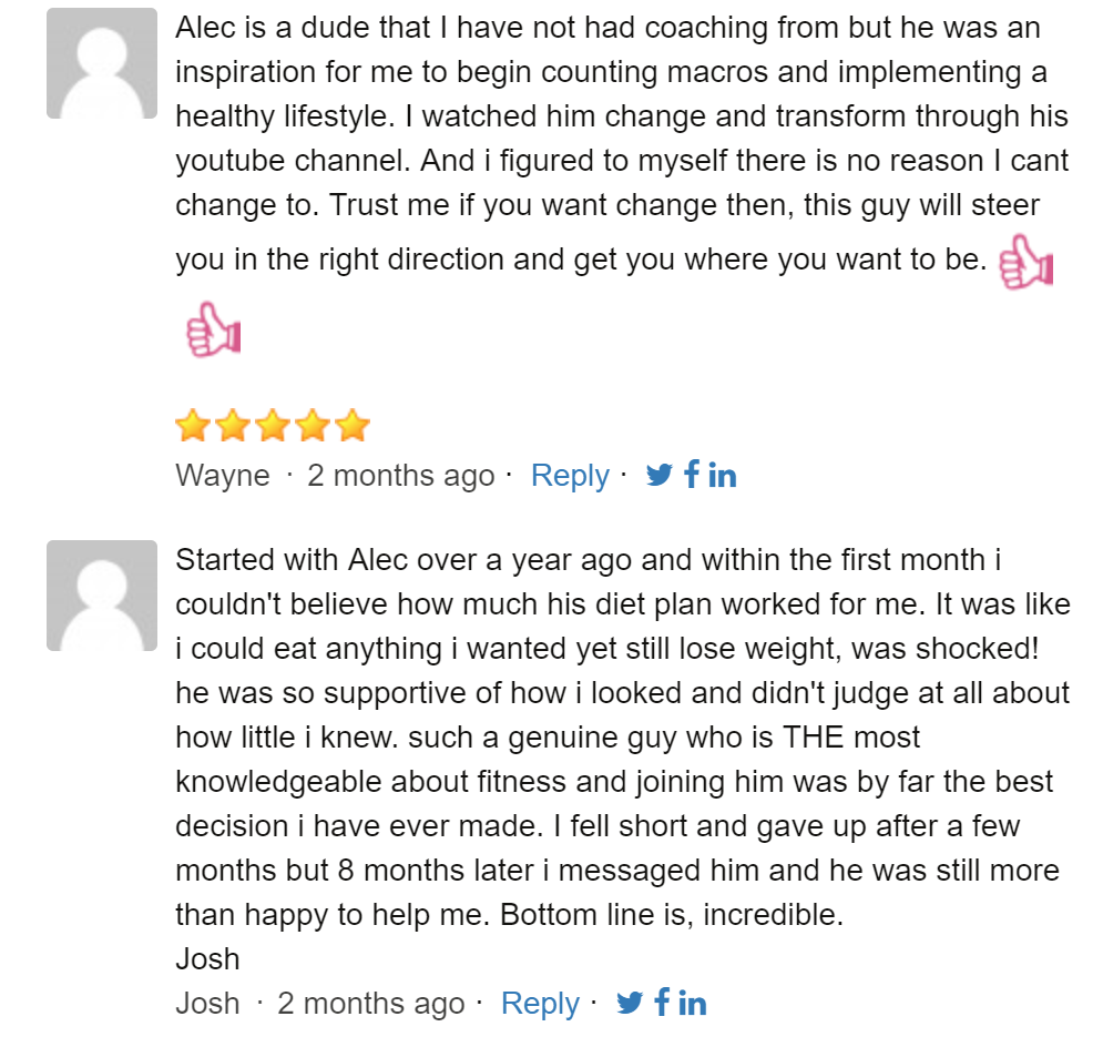 I now have figured a way to eat huge satiating meals with zero dietary restrictions. I don't have to do a lick of cardio at all each week to cut body fat. I have also found a balance where I can maintain a fun lifestyle where I can go out with friends/family and not be this robot that can't eat anything other than Tupperware meals. Now for me the journey isn't about myself anymore, I've cracked the code on nutrition and I want to share it with as many people as possible because my life has been forever changed. Scroll down below to see some lives of people I'm already impacting. I'm on a mission to change thousands of lives and would love to assist you in changing yours.
